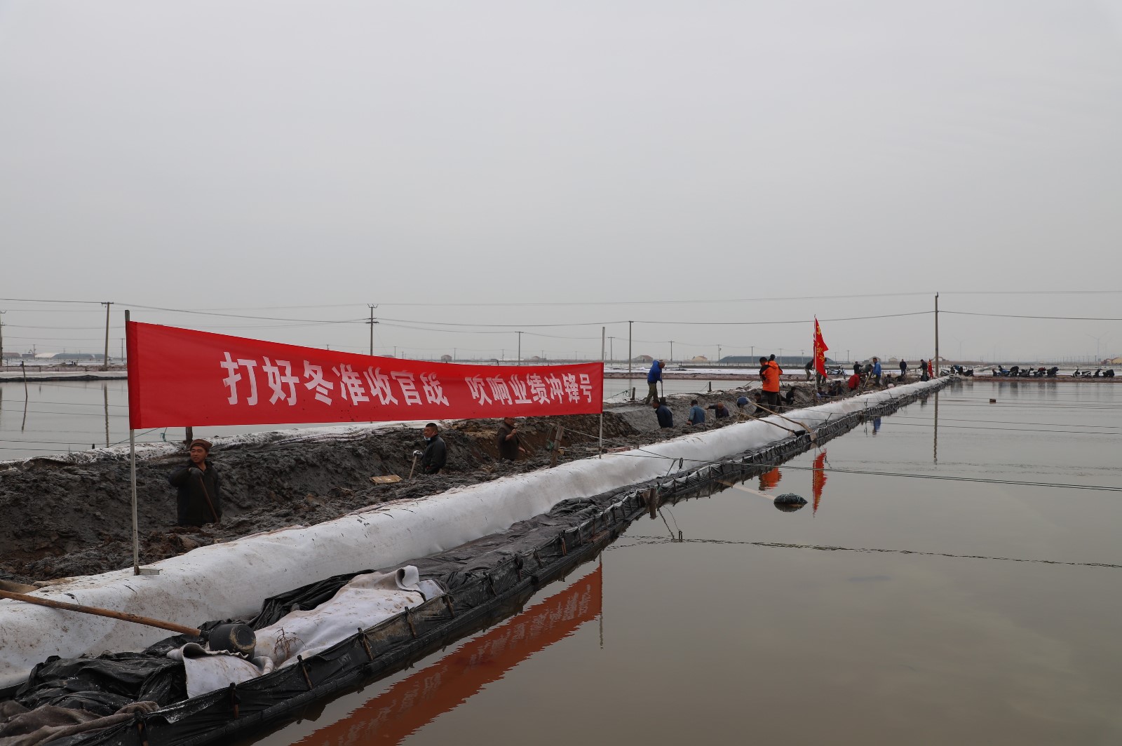 在新河制鹽分公司鹽田地頭的冬準(zhǔn)會(huì)戰(zhàn)現(xiàn)場(chǎng),人頭攢動(dòng),工人們正動(dòng)作嫻熟的進(jìn)行澆水、翻泥、踩實(shí)、做埝、整平……,鹽工們?nèi)?zhēng)先進(jìn)位,手腳不停的揮鍬挖泥,呈現(xiàn)出你追我趕、比肩發(fā)力的勞動(dòng)場(chǎng)景。一條條溝道改造、格堰修整等亮化灘場(chǎng)文明建設(shè)煥然一新,一幅幅“人勤春早”的美麗畫卷徐徐展開。