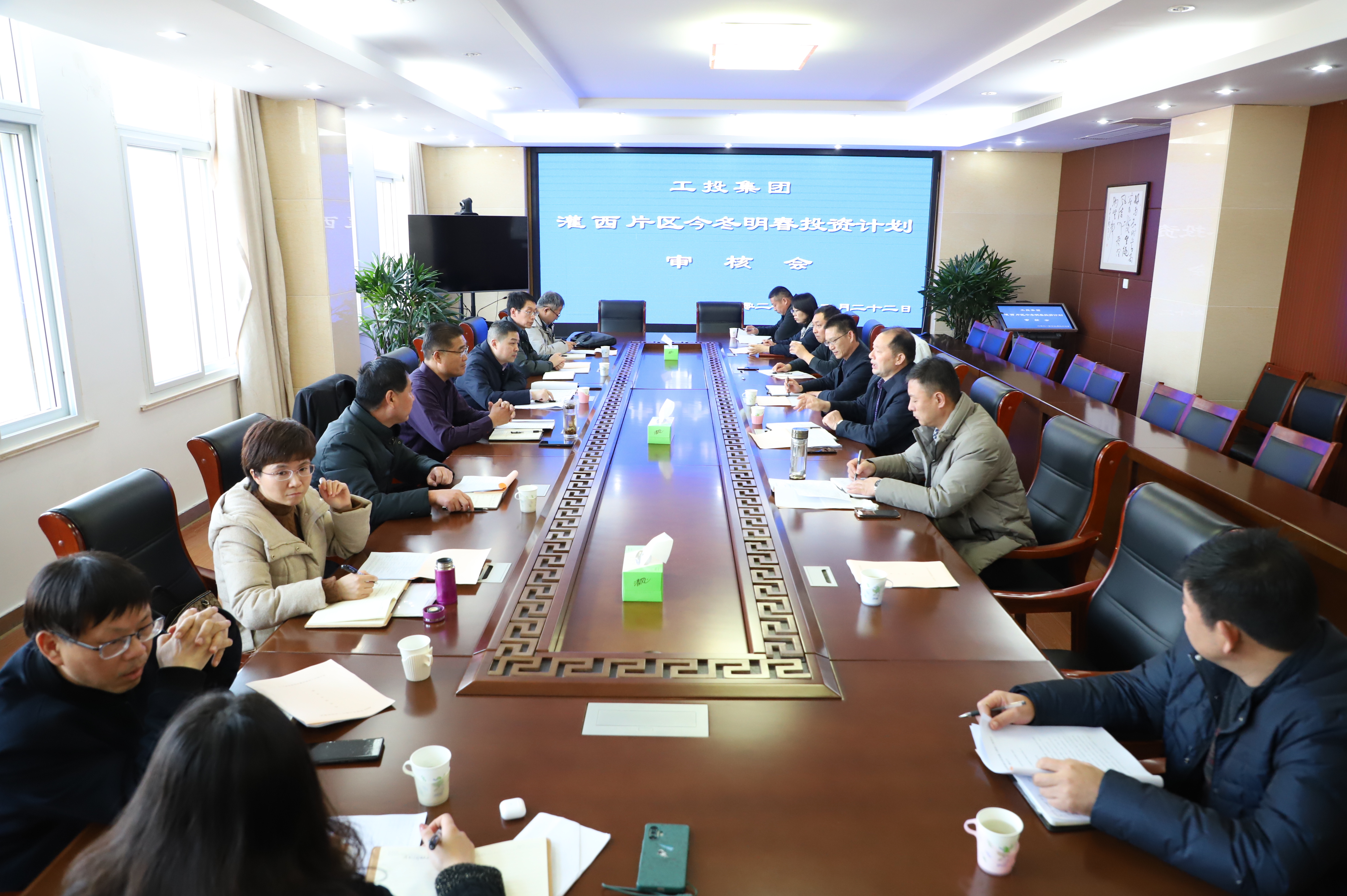 1222日下午,集團公司副總經理劉承志一行來灌西片區召開今冬明春投資計劃審核會,調研2022年計劃投資項目。灌西投資公司董事長、總經理李國文、常務副總經理吳衛平、總經理助理潘二衛及規劃、財務、安全、資產等相關部門負責人陪同調研。