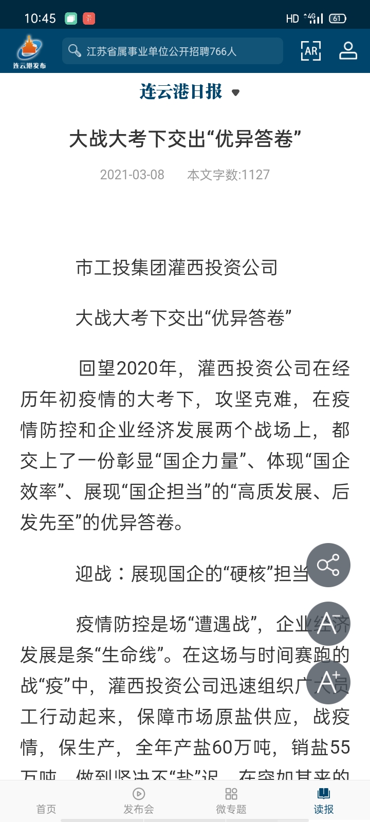 嚴冬之后就是暖春,疫情之后就是百花齊放、花香滿園。在疫情得到有力有效控制并做好常態化疫情防控的前提下,灌西踩足復工復產大油門、按下經濟發展快進鍵,先后對到期1萬余畝農田、5千余畝養殖池塘對外公開租賃,實現資源創效8千萬元。硬仗,一場接著一場,也因疫情讓灌西五灌河碼頭運輸一度的停產,在克服疫情造成的不利影響,依托徐圩、燕尾產業區內大型企業,承接化工噸袋、鋼材、管樁、碳素等轉運業務,全年碼頭吞吐量超110萬噸。經濟發展勢頭不減,民生福祉標準不降。去年,圍繞新時代產業工人隊伍改革出臺以“點、線、面、體”的灌西產改12條舉措得到有效落實,其中“一星三制”產改工作機制被市總工會在全市推廣,職工收入增幅達12%