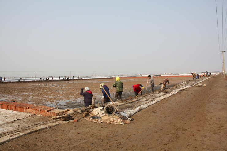 3月21日,在新河制鹽分公司八班的一期結晶區,一片火熱景象,只見大家正在灘內揮膀大干,挖泥的、和泥的、打堰的,配合密切,運作熟練,參加勞動的職工足有50余人。“為了加快食用原料海鹽基地建設進度,今天,我們集中了7個組班的員工幫助八班維修下馬格格堰,爭取早日灌池生產。”正在工作現場安排工作的該公司經理安樹林說道。