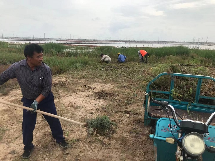 埒南制鹽分公司開展灘場文明建設,對各班灘場文明進行集體整頓。完成塑料布整理、清理溝道、值班室整理、鹵臺雜物清除等工作,主要是清理灘內雜物雜草,對值班室、大小機房附近雜草進行清理。并對扒鹽機械進行統一保養、擺放,為即將到來的秋扒奠定基礎。圖為工人正為灘內雜草進行清理。(孟然)