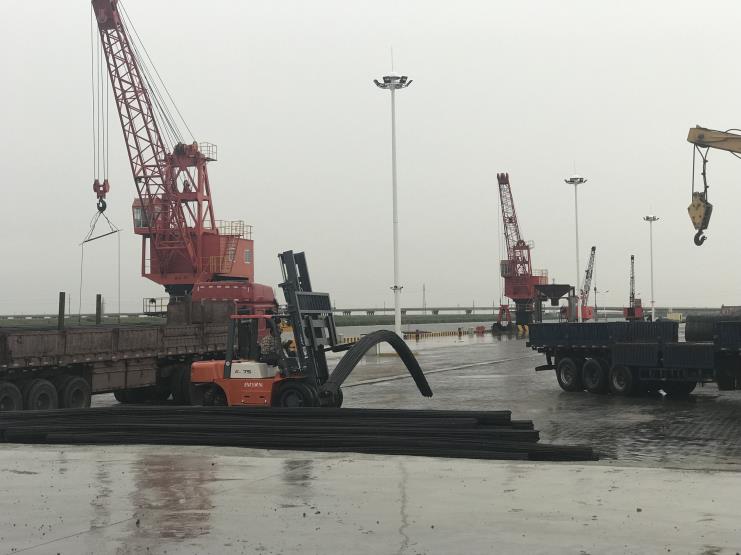“戰(zhàn)高溫,迎酷暑”,宵洋碼頭從早上開始就忙得如火如荼。裝載管樁的貨船進(jìn)入碼頭,工人們就開始操作著塔吊,穩(wěn)穩(wěn)當(dāng)當(dāng)?shù)膶⒐軜?ldquo;放”入貨車。貨車裝載的盤螺,鋼筋也紛紛到碼頭場地上裝卸。一切工作都井然有序的進(jìn)行著。