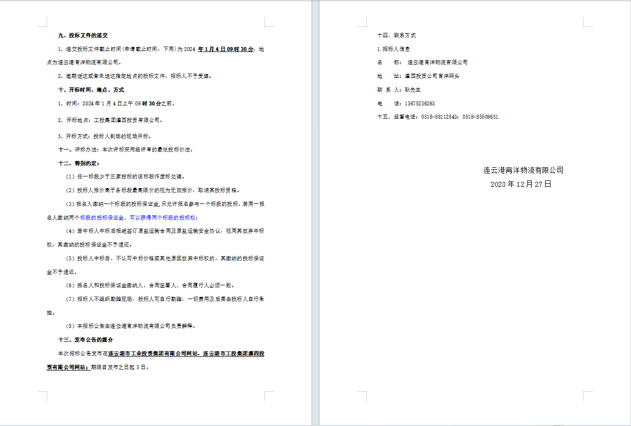 連云港宵洋物流有限公司原鹽車輛運輸服務業務招標公告(二次)
