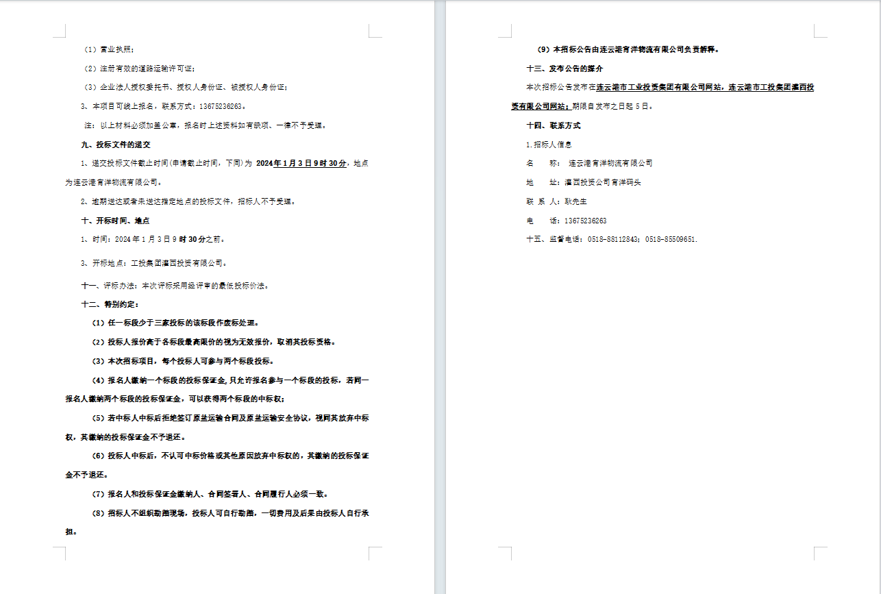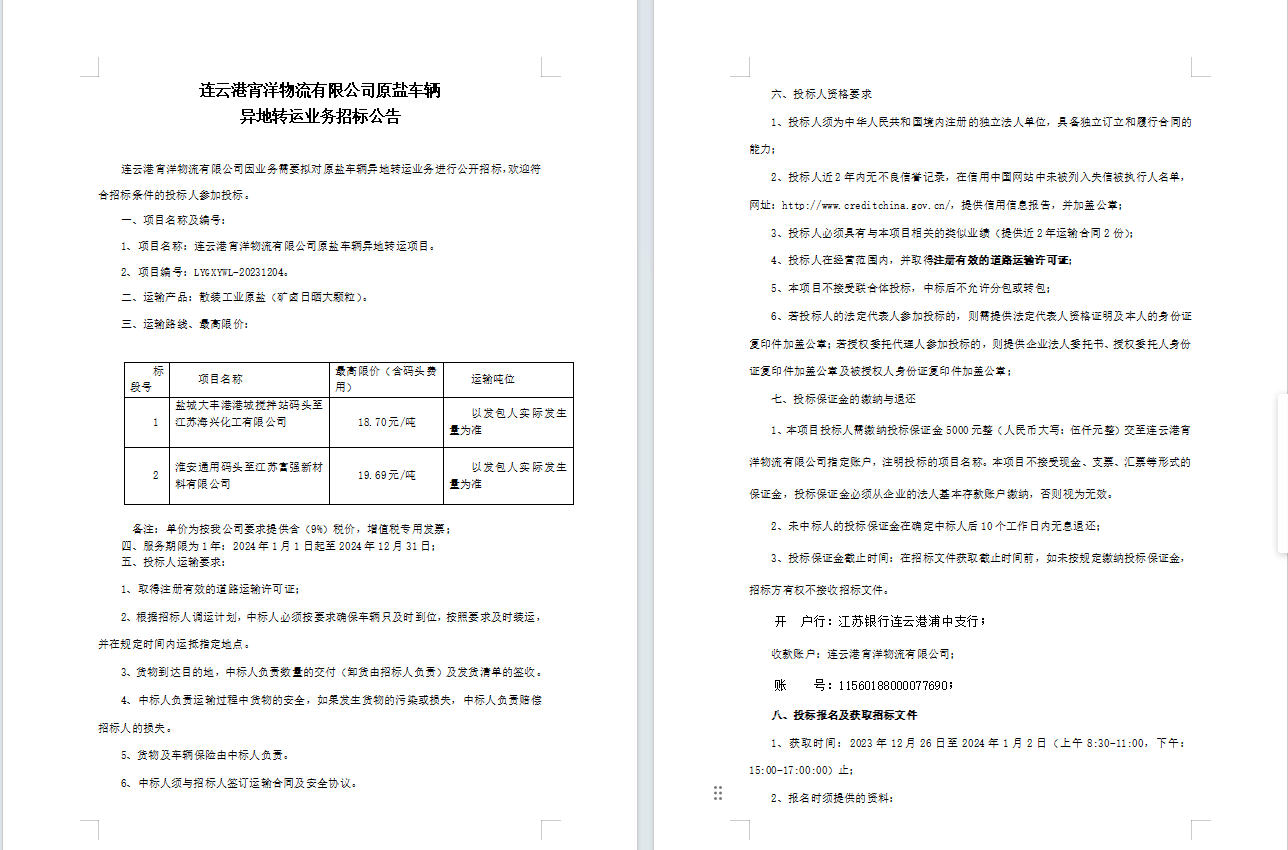 連云港宵洋物流有限公司原鹽車輛異地轉運業務招標公告