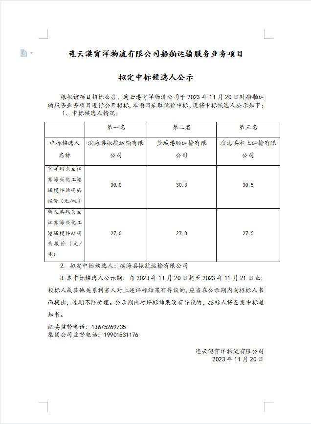 連云港宵洋物流有限公司船舶運輸服務業務項目擬定中標候選人公示