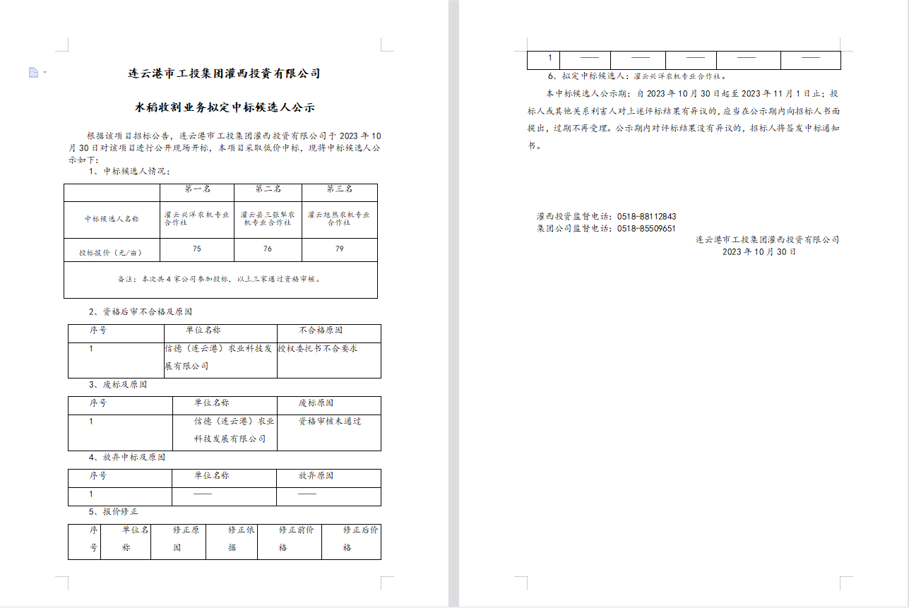 連云港市工投集團灌西投資有限公司水稻收割業務擬定中標候選人公示