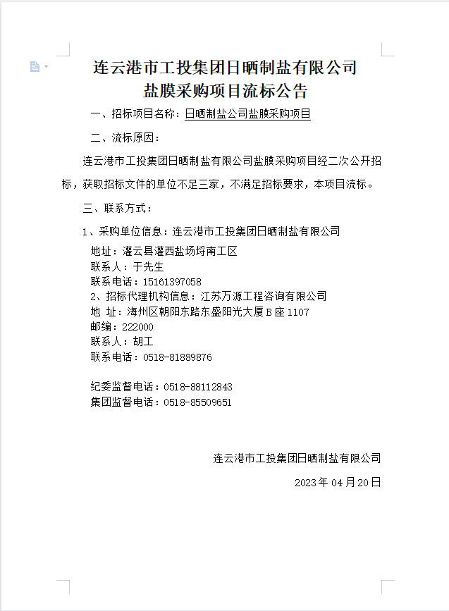 連云港市工投集團(tuán)日曬制鹽有限公司鹽膜采購項目流標(biāo)公告