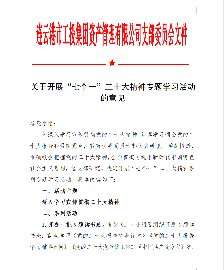 為在金融板塊快速掀起學習宣貫黨的二十大精神熱潮支部精心組織、積極籌劃,完善學習方案,創新學習教育形式,豐富黨建活動載體,支部結合公司實際,專門制定《學習宣傳貫徹二十大精神學習方案》、《關于開展“七個一”二十大精神專題學習活動的意見》。