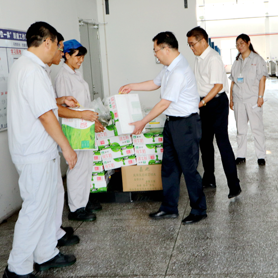 81日上午,集團公司黨委副書記戴鴻鳴、工會主席劉承志來我公司慰問生產一線員工,為辛勤工作的員工送來牛奶、綠豆等防暑降溫慰問品。公司黨支部書記、副董事長鄒德兵,總經理韓立新等多位領導陪同。