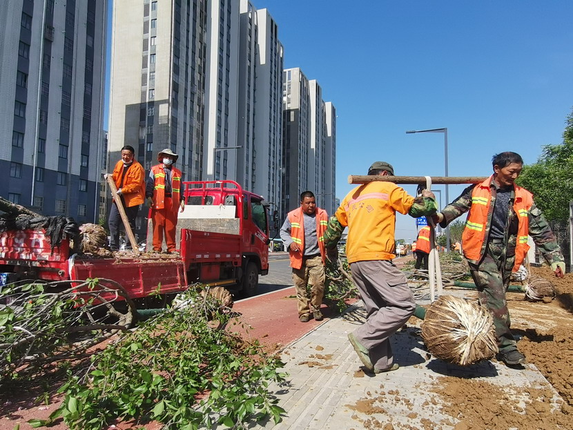 51日早上七點不到,在鏡湖路上,四十余名綠化工人已經開始卸苗、栽苗。為確保有序施工、保質保量、按期完成,公司負責人范曉寶帶領技術人員堅守在施工一線,牢固樹立時間觀念,強化職責使命,督促指導搶時間、趕進度、保質量,全力加快挖坑整地、苗木種植、草坪鋪墊、澆水修剪等工作。同時,督促做好現場安全、后勤保障相關工作。當日下午,累計種植小葉黃楊300余平方米、日本晚櫻70余棵。