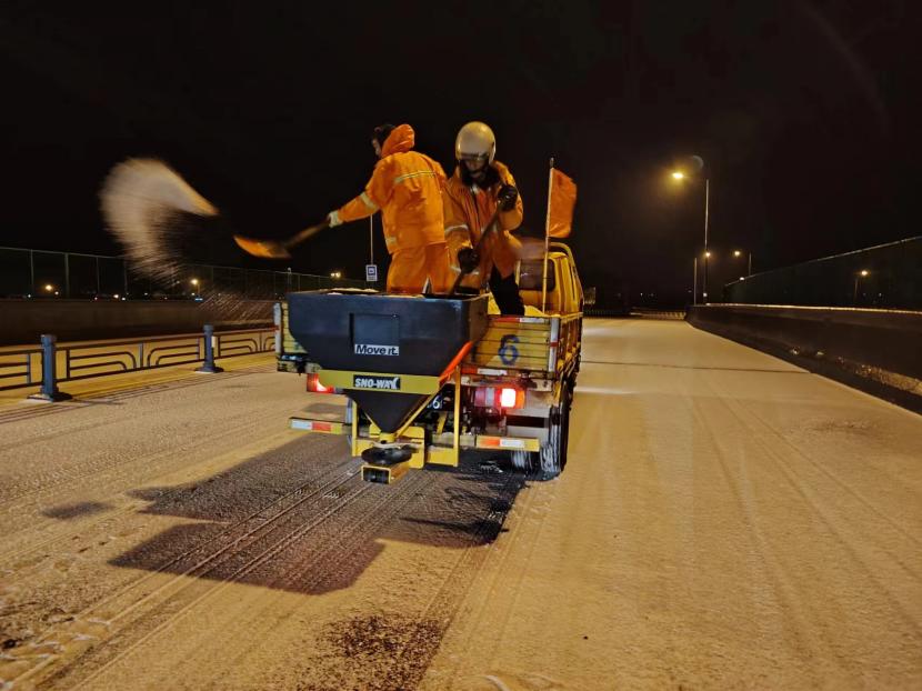 受寒潮影響,2月20日下午,港城普降“冰雪+冰粒”,投資公司第一時間啟動惡劣天氣應(yīng)急處置預(yù)案,道路保潔、市政養(yǎng)護、后勤保障等戰(zhàn)線的干部職工以雪為令,在重點區(qū)域、重點路段、坡道、橋梁、涵洞等結(jié)冰路段進行撒鹽融雪融冰作業(yè),全力以赴除冰雪、防事故、護平安,為市民群眾出行一路“護航”。