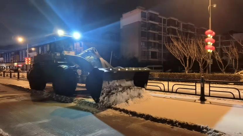 當晚,按照“即下即清、先通后凈、保障通行”的清雪除冰原則,在統(tǒng)一調(diào)度下,一臺臺清雪設(shè)備有序穿行于道路上,撒布機打頭陣,推雪板車緊隨其后,將路面積雪進行打通,地上的雪從前向后逐次被清雪車輛推向道路邊緣。隨后,由人工加以配合,在人機結(jié)合方式下,冰雪被裝到車上清運走。