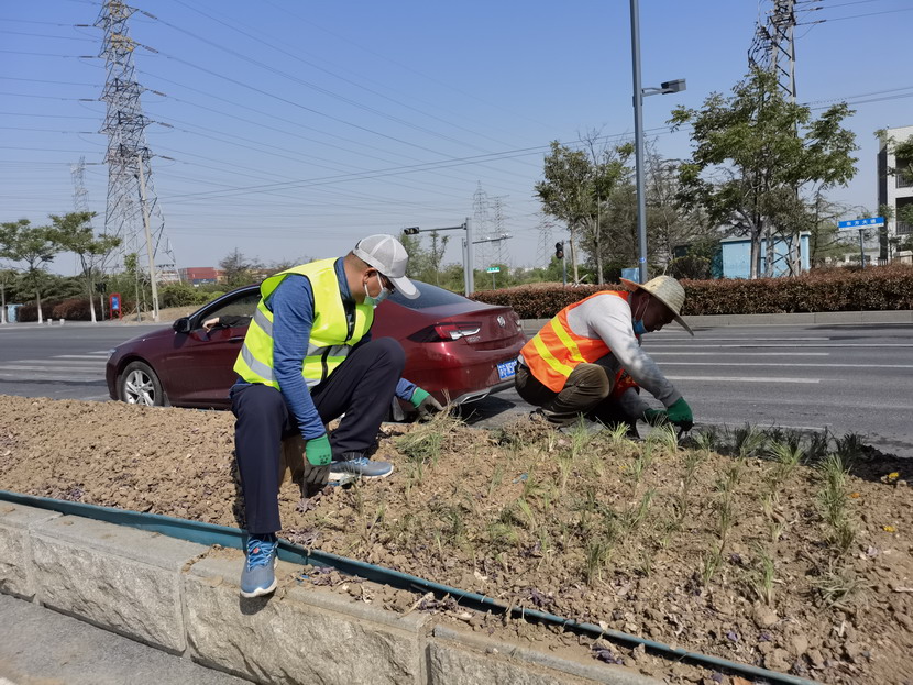 臨達、美多利、資源分公司等黨支部組織聯合突擊小隊,從430日起主攻黃海大道綠化責任區,時至中午“不下火線”,黨員職工就著礦泉水,啃著自帶的煎餅,節約時間搶工期。