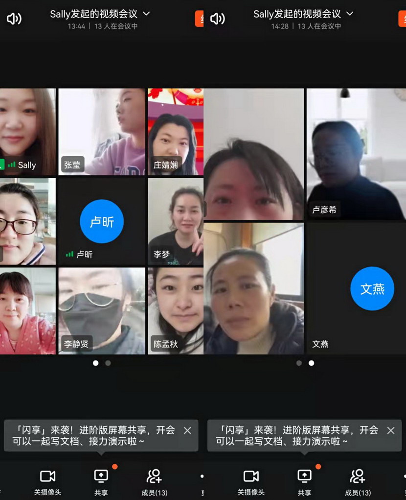 線上貢獻(xiàn)篇。“縱然居家隔離,一樣不防礙我們做貢獻(xiàn),我們線上服務(wù)已經(jīng)開啟”三八節(jié)這一天,在社區(qū)忙碌一天的公司女工委副主任宋文靜又特意安排了“三八”節(jié)線上活動(dòng)。這一天活動(dòng)精彩紛呈:首先是視頻連線,通過(guò)廣大女工并向她們家人傳達(dá)市委市政府以及集團(tuán)黨委、投資公司黨委關(guān)于疫情防控文件精神。其次共同學(xué)習(xí)全國(guó)“兩會(huì)”會(huì)議精神。第三,開展公司“三新”解放思想大討論線上論壇,圍繞疫情防控、生產(chǎn)經(jīng)營(yíng),尤其是企業(yè)轉(zhuǎn)型發(fā)展出謀劃策。最后還來(lái)了點(diǎn)小游戲-成語(yǔ)“飛花令”,給嚴(yán)肅的疫情防控增添了一息歡樂(lè)的氛圍。