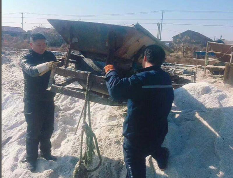 在海洲灣公司的海濱三組原鹽集運現場,過河原鹽皮帶機滾籠上的鋼筋因機械疲勞斷裂造成無法運轉。為了不影響原鹽集運,接到通知后,機械班維修人員冒著刺骨嚴寒迅速攜帶電焊機等維修工具趕到現場。露天下,檢查拆卸、焊接加固、安裝調試一氣呵成,很快機械又重新運轉起來。