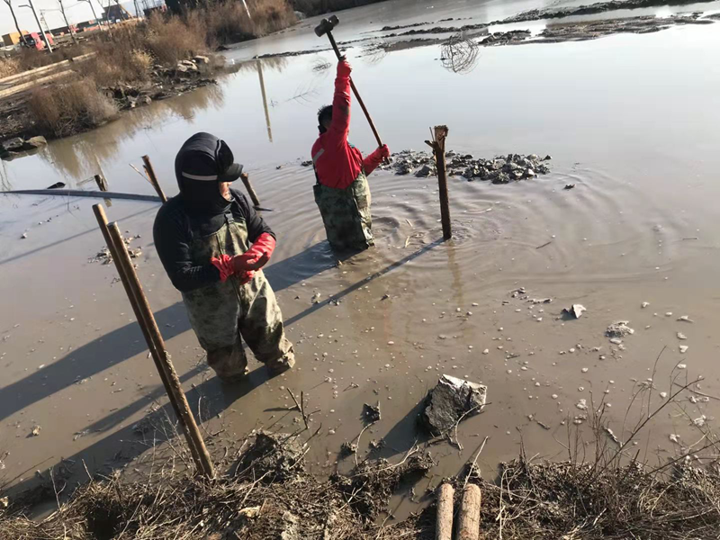 管道巡查發現通往堿廠的鈣液輸送管道因天氣影響爆裂損壞在送水道泥水中,搶修難度陡然增大。在困難前,我們干事豪情直面挑戰、創業激情燃燒嚴寒,穿上臃腫的防水皮衩深入到齊腰深的冰水中,卷起袖子雙手在水下摸索著對接管道,擰緊哈弗節上的每一根螺絲,接下來的打樁捆綁固定一切皆是那么的嫻熟。什么寒風侵肌、冰澈透骨全然阻擋不住我們“鐵軍”干事創業的激情,鏗鏘有力的大錘不斷打下新一年的希望。