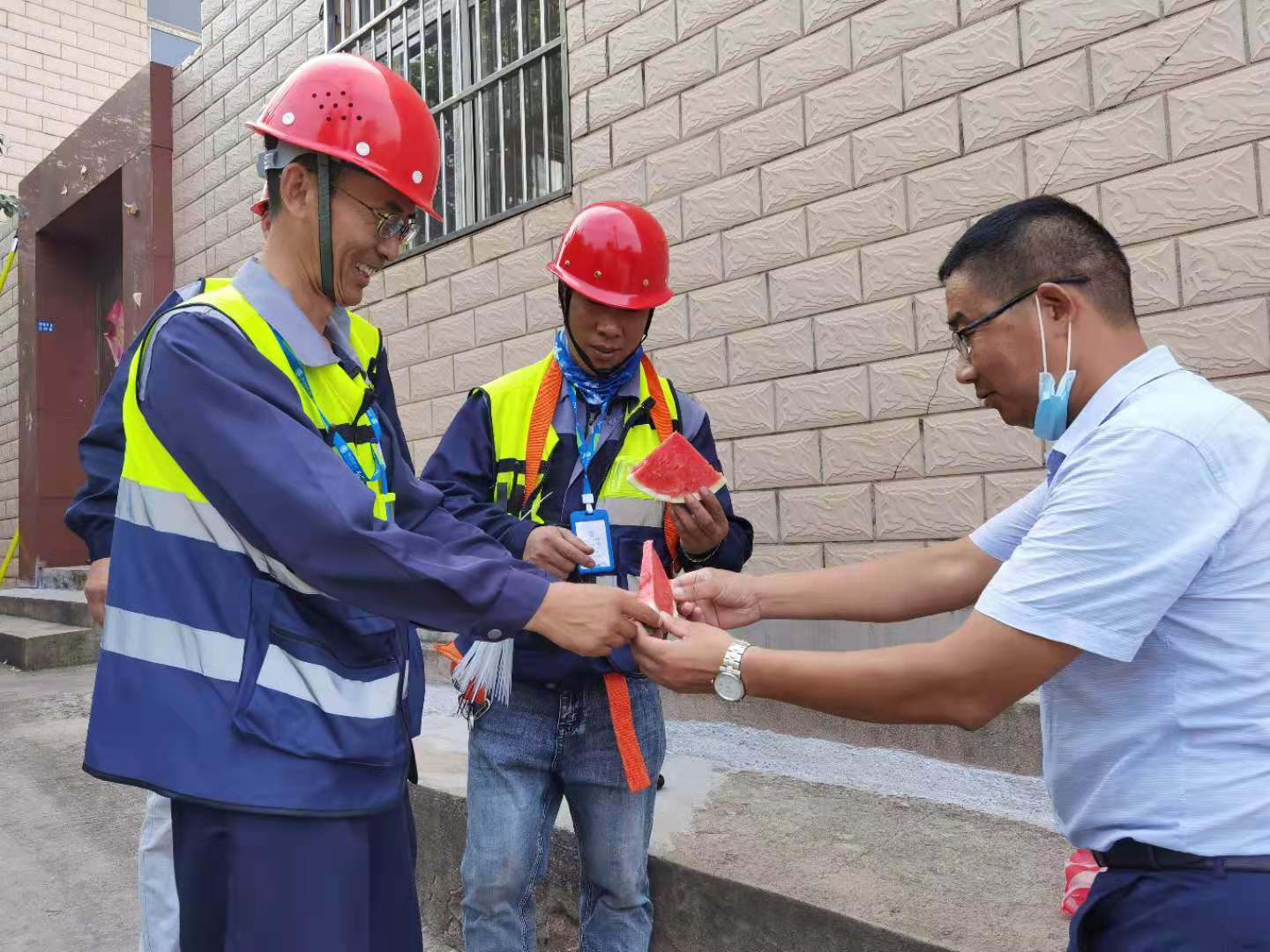 8月19日下午,翔立分公司工會為奮戰在移動線纜整理第一線的職工送去西瓜,為他們帶來組織的關懷,在炎炎夏日送上絲絲涼意。為完成今年下達的目標經營任務,通信各小分隊的成員不懼高溫“烤驗”,全力以赴堅守在工作第一線。路邊瓜香彌漫,讓這個夏天不再炎熱。