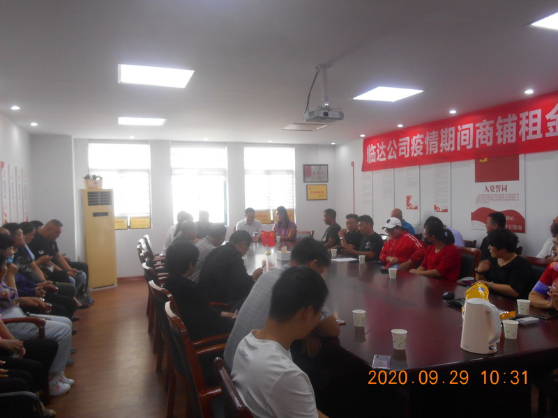 臨達公司黨支部堅決和黨中央保持一致,堅決擁護黨中央的決定,認真學習了省、市以及集團公司等減免疫情期間房租的相關文件精神,仔細研究、反復討論,經上報臺北投資公司、集團公司兩級黨委批準,929日下午,減免光伸建材市場、德蘭建材市場、金三角市場、原公司院內倉庫、院外大棚、猴嘴山洞共48家商戶3個月租金,計52萬余元,減免金額達全年租金收入四分之一。