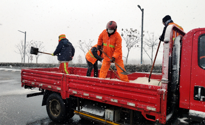 悅升公司按照責(zé)任分工,分包路段、分配任務(wù),出動除雪機械設(shè)備,夜以繼日、奮戰(zhàn)一線,緊張有序地開展道路冰雪清除工作。本次出動保障人員160余名,兵分7路,2路裝卸隊負(fù)責(zé)將提前采購好的200多噸融雪劑有序裝車,5路道路保障隊負(fù)責(zé)各自區(qū)域內(nèi)的冰雪清除。保障人員克服地面濕滑、氣溫驟降等不利因素,秉承“減存遏增”的理念,各路段按照人工+機械的方式,采取“邊下雪邊除雪”的工作模式,共出動2輛雪輥車、4輛大雪鏟車、1臺撒播機、運雪皮卡和廂貨車共11輛,循環(huán)開展除雪作業(yè),各組之間配合默契,大大提高了工作效率。